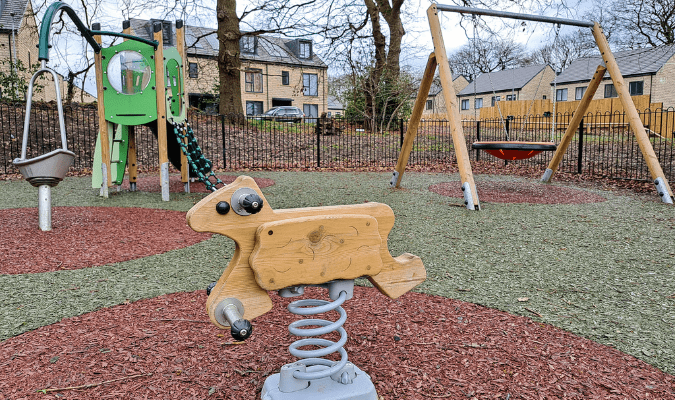Timber Sheep Springer in a natural playground with a Little Hamlets Tiddleywink Plus multi-play unit and Timber Team Swing, set on green and red rubber mulch surfacing among mature trees in Calverley Lane housing development, Leeds.